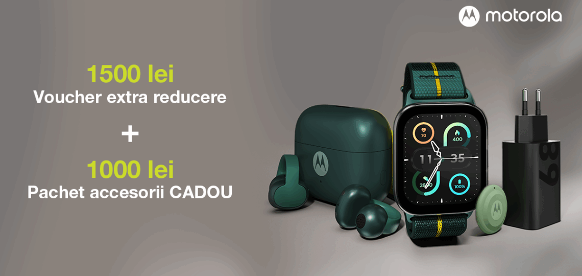 Între 15 octombrie și 5 noiembrie, clienții care se înscriu pe www.emag.ro/motorola  pot beneficia de o ofertă limitată, cu avantaje în valoare totală de 2500 lei